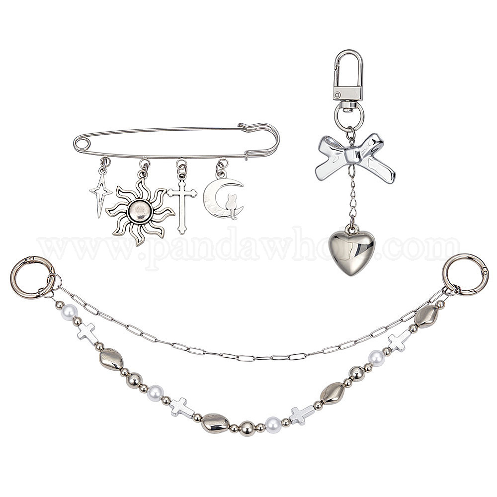 • Платина 3шт 3 стили сердце солнце крест пластик и сплав звенья сумка декоративные цепи и брошь, с поворотными застежками сплава, платина, 56~322 мм, 1 шт / стиль