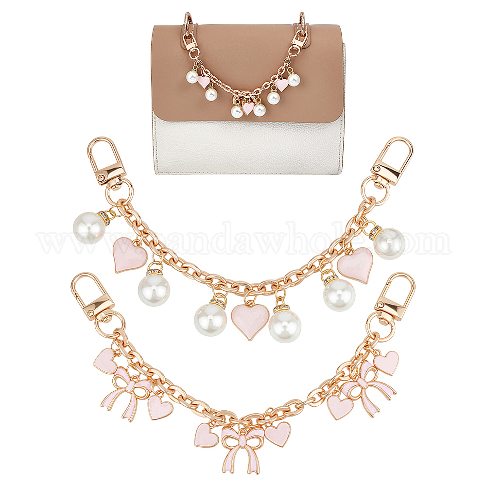 4 шт. 2 стили сплав розовая эмаль бант сердечки подвески сумки декоративные цепочки, с имитацией жемчуга из смолы и поворотными карабинами из сплава