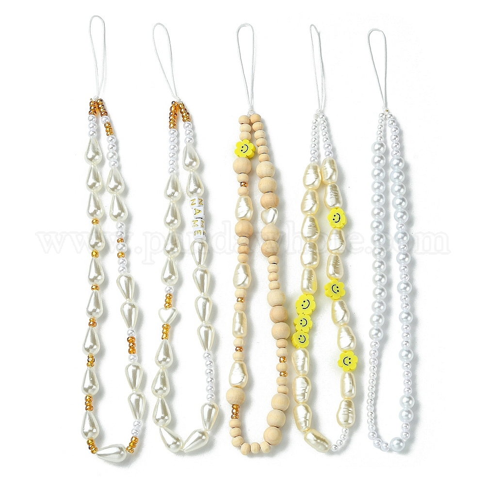 1 набор ремешков для мобильного телефона из пластика ABS с имитацией жемчуга, дерева и полимерной глины, украшение мобильных аксессуаров из нейлонового шнура, круглый и каплевидный и цветок