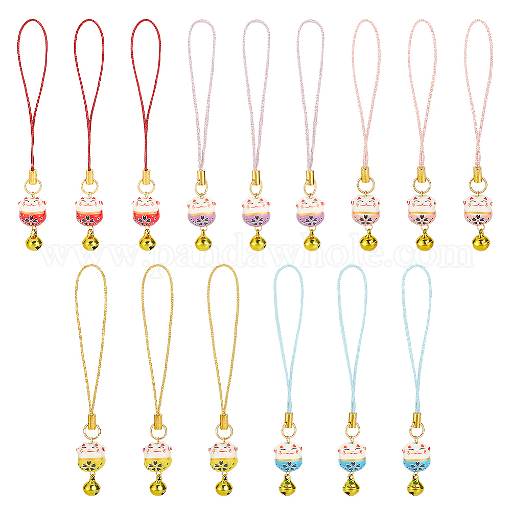 Подвесные украшения из фарфоровых бусин ручной работы с принтом, с латунными подвесками-колокольчиками для телефонных цепочек на руку, форма кошки, золотые