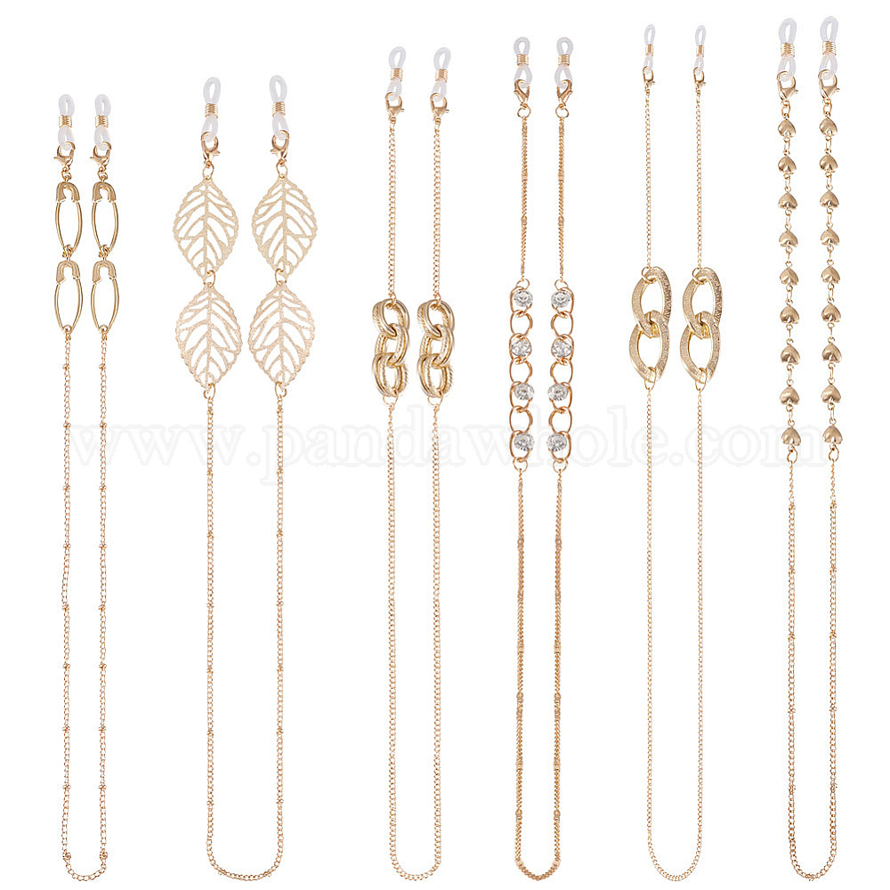 6 шт 6 стиль цинковый сплав цепочки для очков, шейный ремешок для очков, с пластиковыми петлями на концах, с блокирующим кольцом, листом, стразами и подвеской в виде сердца