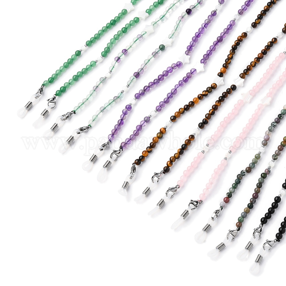 Цепочки для очков, цепочки из натуральных камней ремешок на шею для очков, с резиновыми петлями на концах, натуральной ракушкой, натуральной гематитовой бусиной-разделителем и фурнитурой из нержавеющей стали