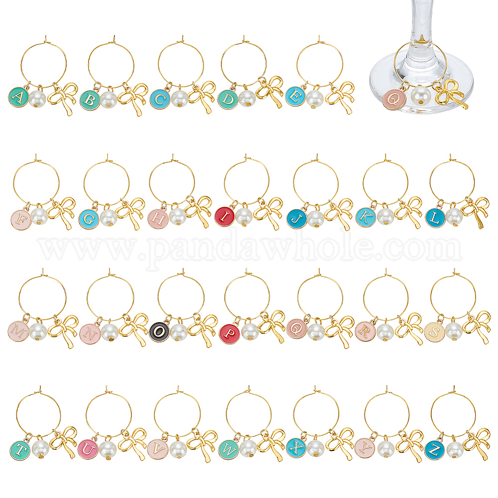 26шт стеклянные подвески для бокалов для вина, с эмалевым сплавом и акриловыми подвесками с имитацией жемчуга, латунное кольцо-подвеска для бокала для вина, бантом, золотые (0368Q6)