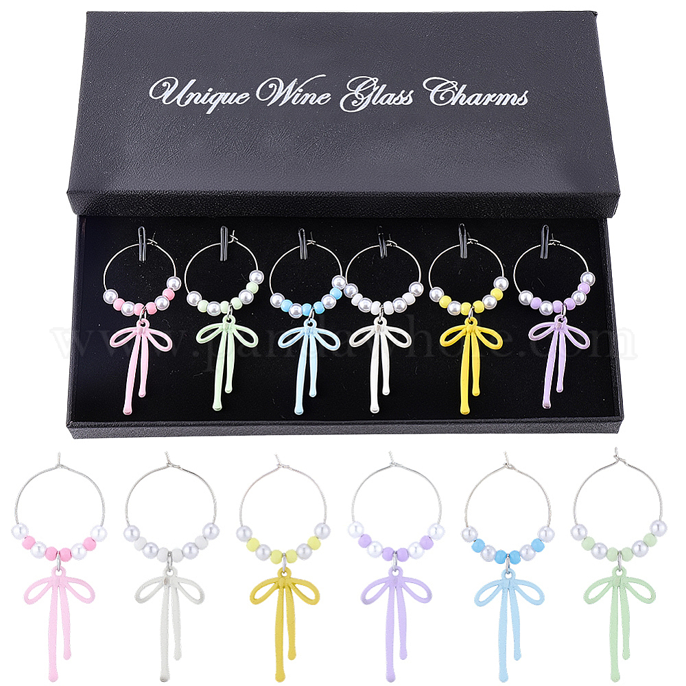 6 шт. 6 подвески для бокалов вина из цветного сплава с эмалью в виде банта из стекла и бисера, с латунным кольцом-подвеской для бокала для вина, платина