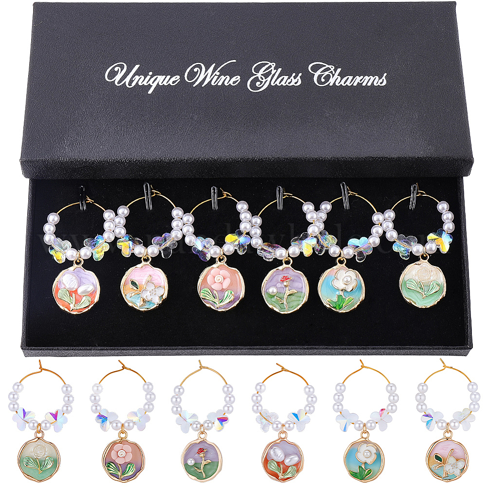 6 шт. подвески для бокалов для вина из эмалированного стекла с цветочным сплавом, с кольцами из латунного бокала