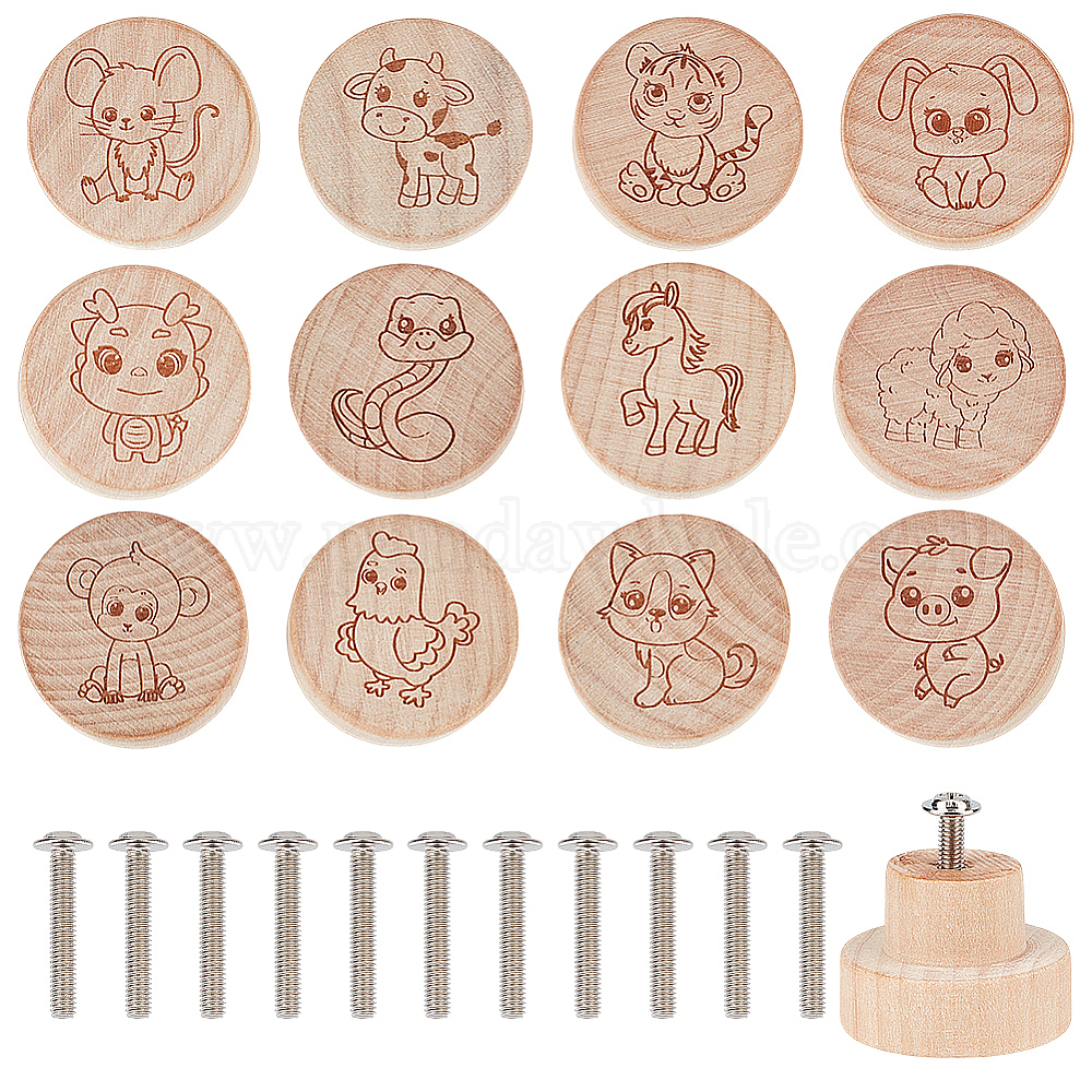 24 шт 12 стили китайские зодиакальные деревянные ручки для ящиков, плоская круглая ручка выдвижного ящика, железный винт, для дома, кабинет, шкаф и комод