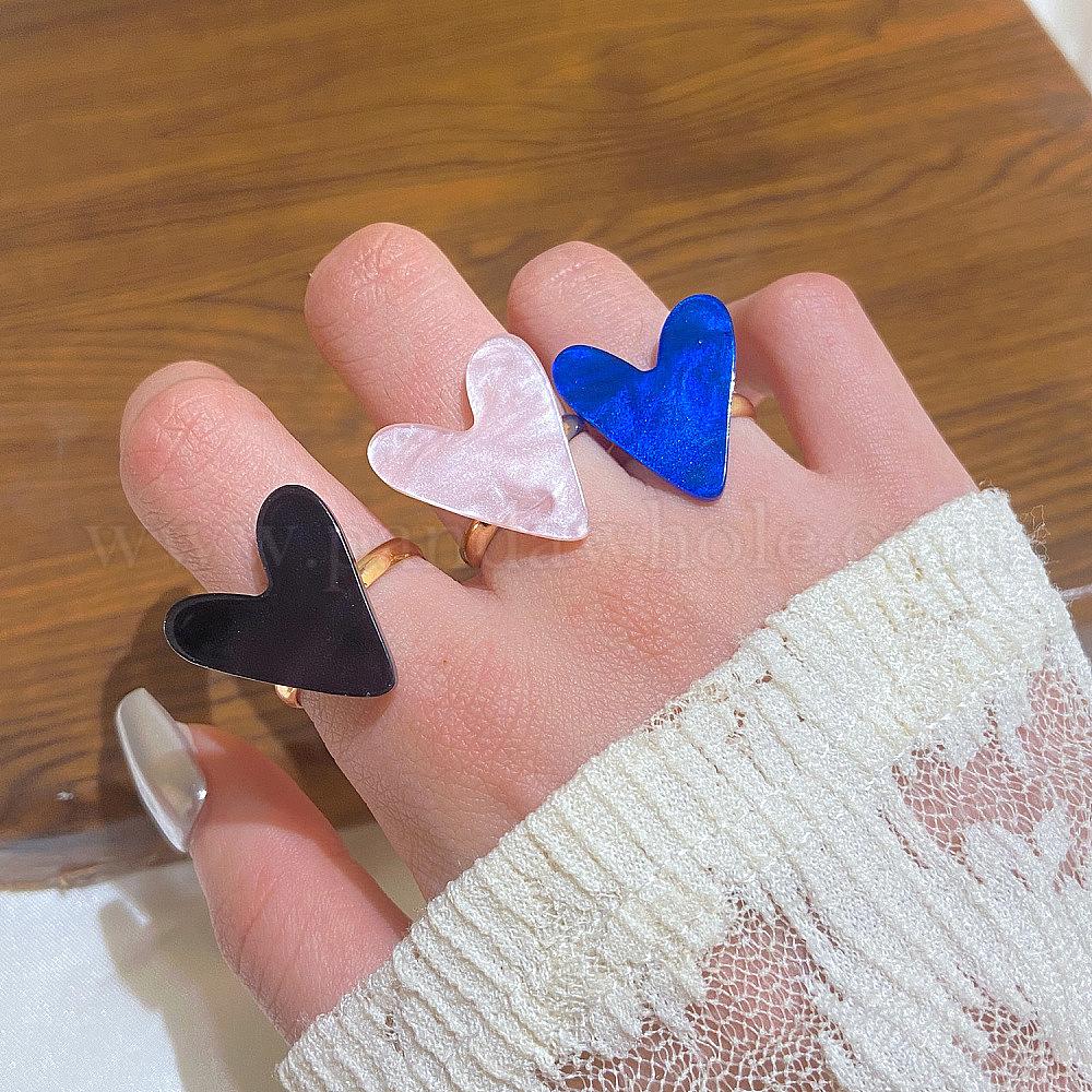 • Черный Женские кольца из латуни с акриловыми вставками, золотые, чёрные, Сердце: 21x20 mm, внутренний диаметр: 18 мм