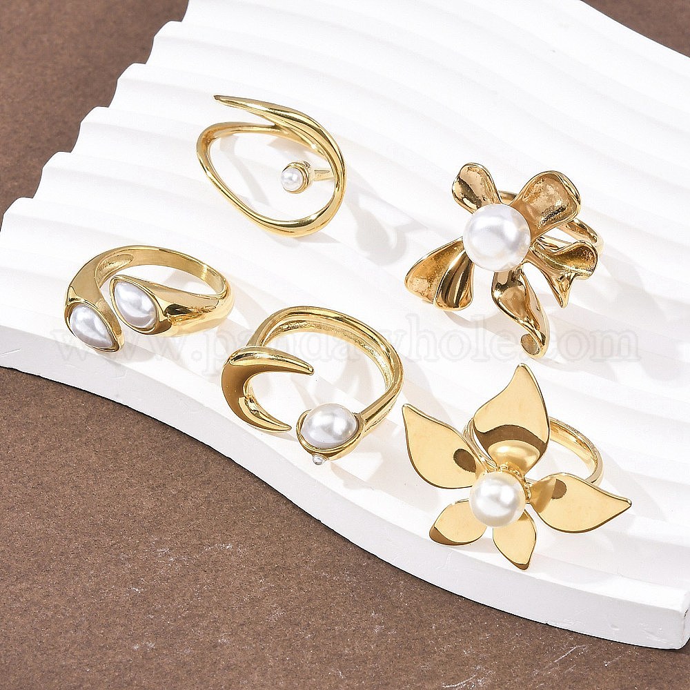 • Цветок Непрозрачные акриловые кольца с имитацией жемчуга, с 304 фурнитурой из нержавеющей стали, ионное покрытие (ip), реальный 18 k позолоченный, цветок, внутренний диаметр: 17 мм, Поверхность: 25x28 мм