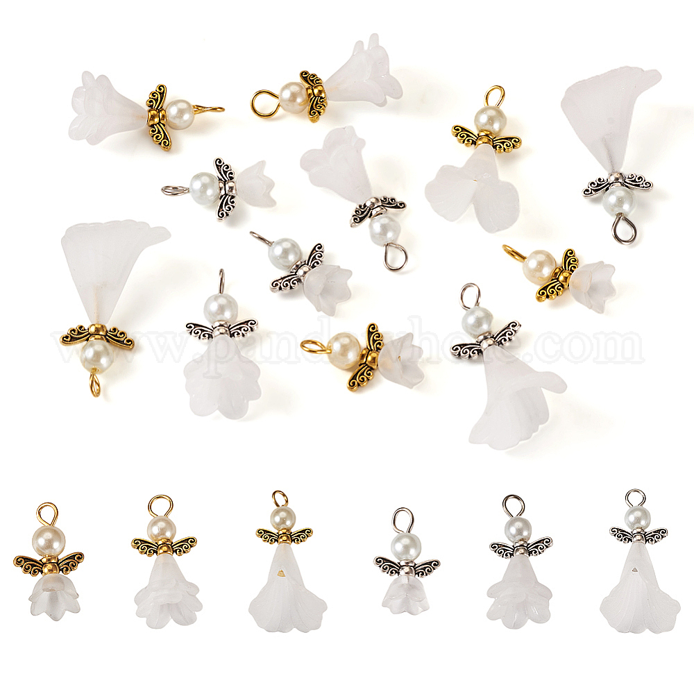 30 шт. 6 стили ангельские матовые акриловые подвески, со стеклянными жемчужными бусинами и крылышками из сплава в тибетском стиле