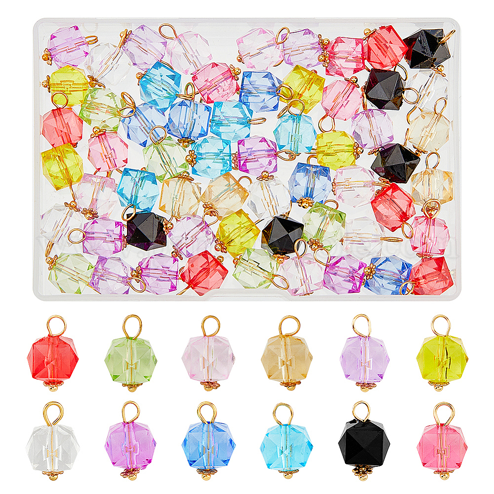60шт 12 цветные подвески из прозрачного акрила, с золотым оттенком 304 петли из нержавеющей стали, подвески в виде граненого куба (02K2E8)