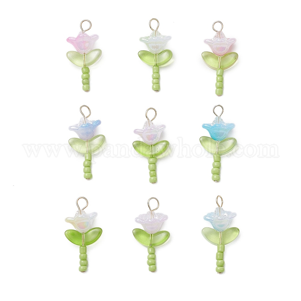 • Весенне-зеленый Стеклянные бусины с имитацией австрийских хрустальных бусин и 304 плоские головки из нержавеющей стали и бусины ручной работы в технике лэмпворк и переливающиеся акриловые колпачки для бусин подвески, цветок, весенний зеленый, 27x14x12 мм, отверстие : 3 мм