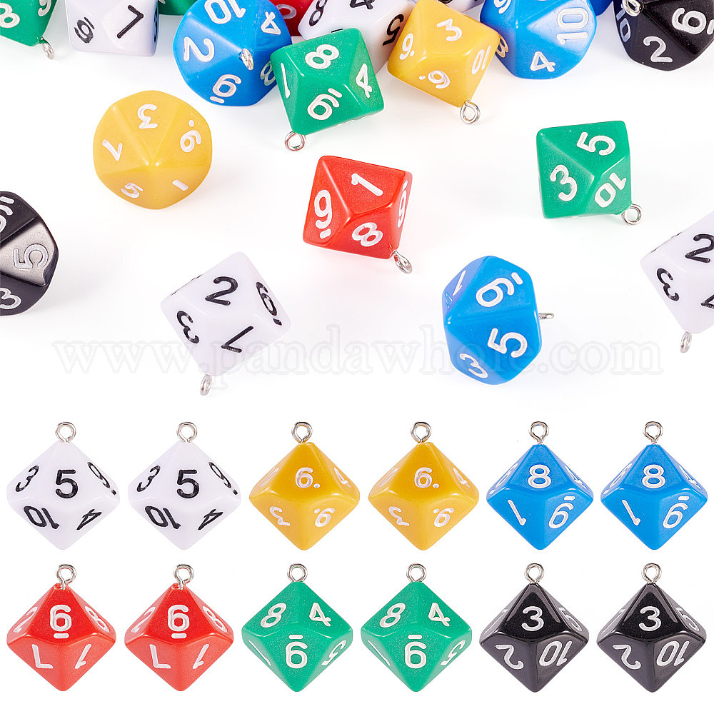 24шт 6 цвета акриловые подвески, с платиново-железными петлями, десять граней, игральная кость