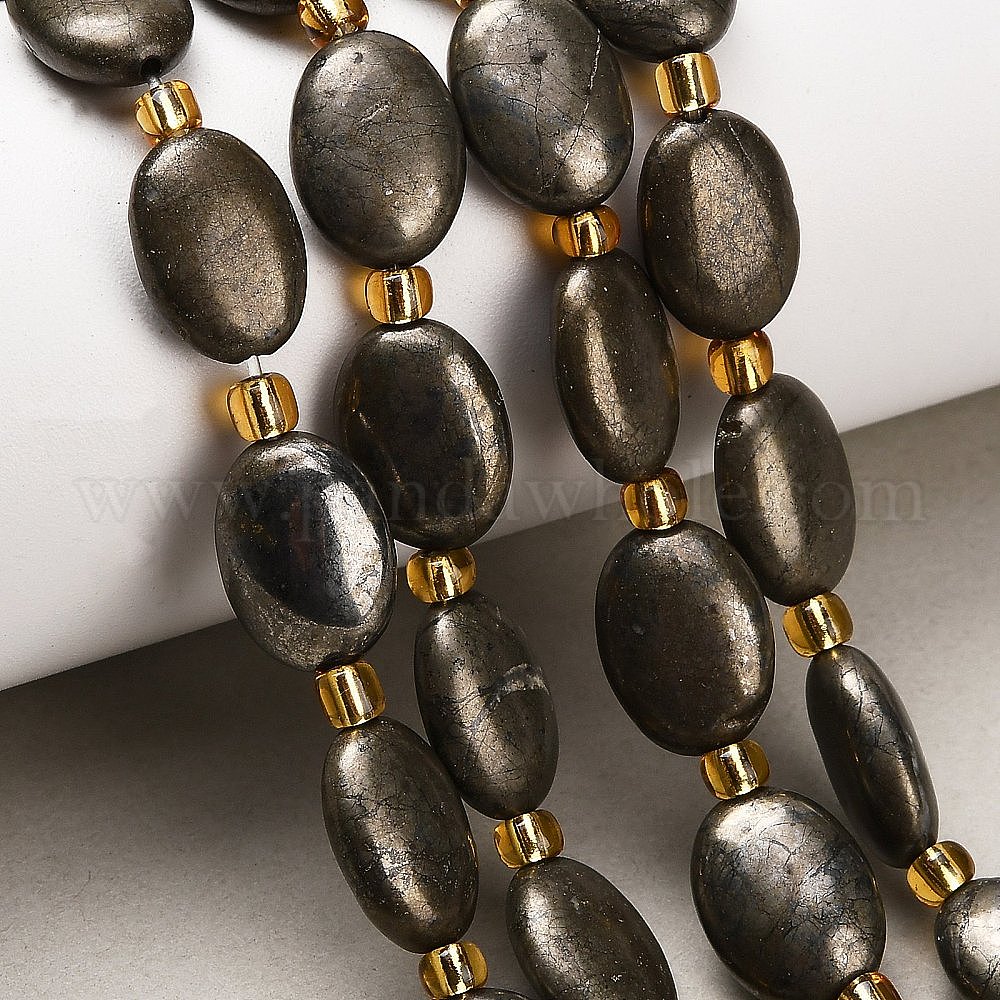 Нити из бусин из натурального золотого пирита/золотого пирита, Плоско-овальные, с бисером