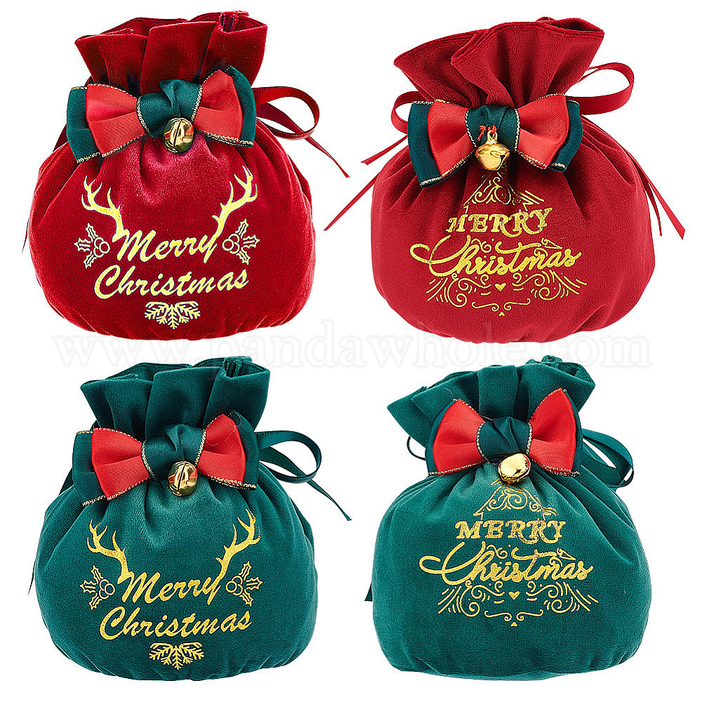 4шт 4 стили рождественские бархатные сумки для конфет и яблок, золотое тиснение слова счастливого рождества мешочки на шнурке с бантом, для упаковки подарков, зеленый и красный, Рождественская елка, северный олень и словесный узор