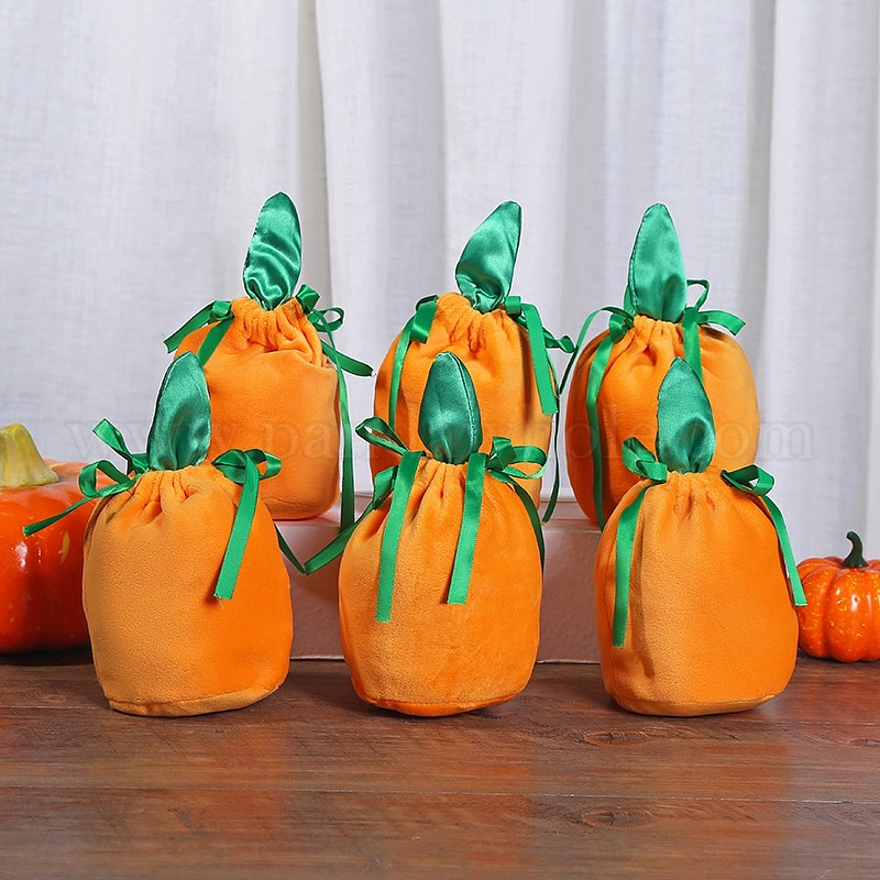 • Оранжевый Бархатные мешочки на шнурке с тыквой на Хэллоуин, подарочные пакеты для конфет, сумки для вечеринок на Хэллоуин, оранжевые, 14x15 см