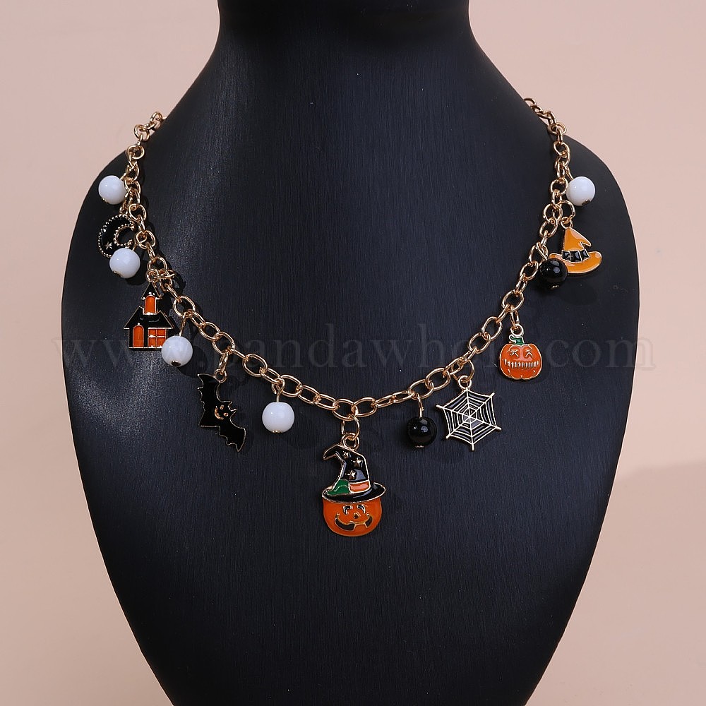 Эмалированный сплав с пластиковой подвеской в виде тыквы на Хэллоуин в виде летучей мыши и паутины, ожерелья с нагрудником для женщин, черный и оранжевый