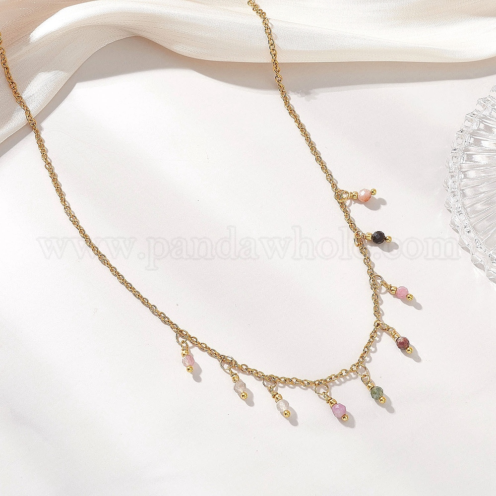 Ожерелье-нагрудник с гранеными круглыми натуральными разноцветными турмалинами диаметром 3 мм и цепочками из нержавеющей стали.
