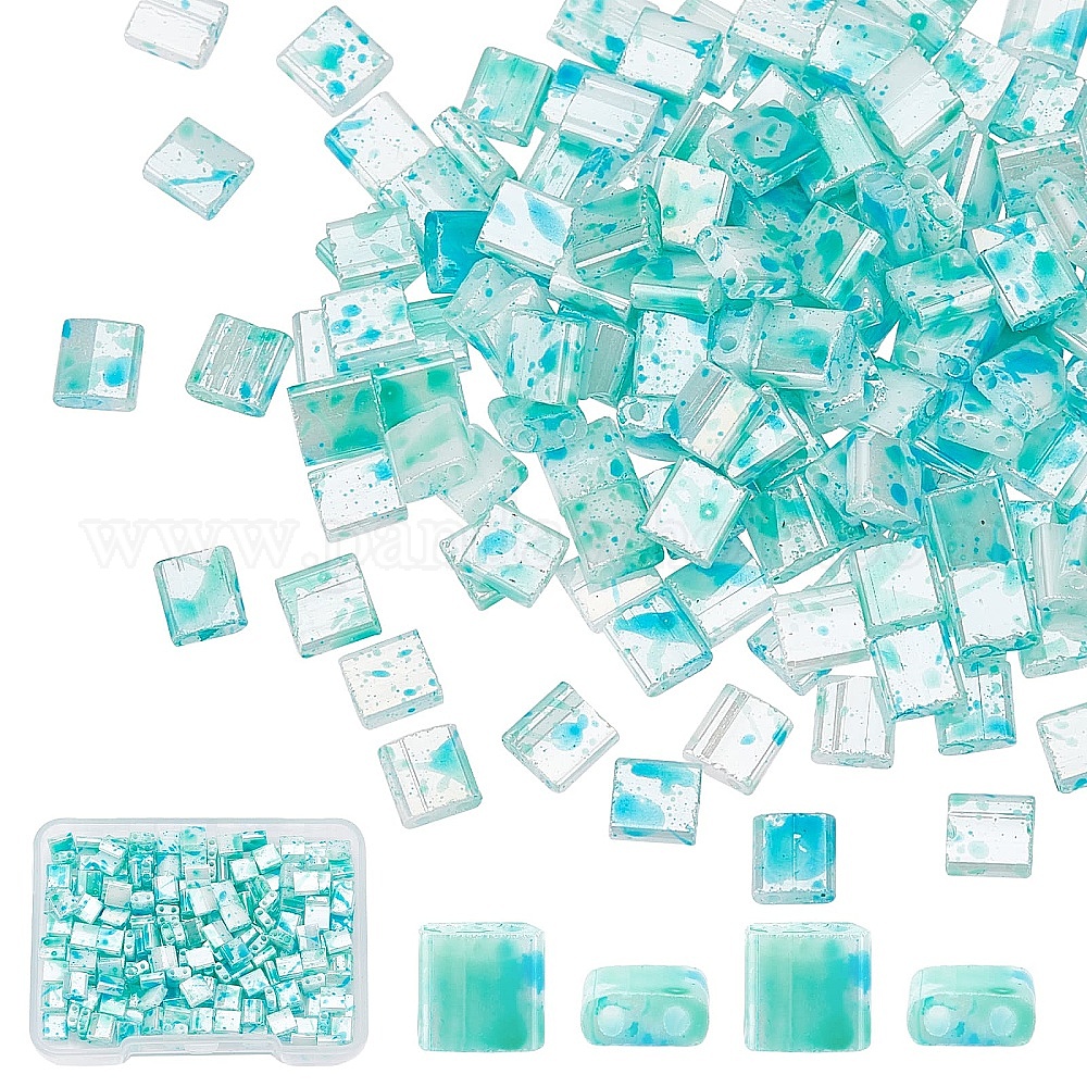• Бледно-бирюзовый 200шт 2стеклянный бисер с отверстием, непрозрачная окраска распылением, прямоугольные, бледные бирюзовая, 5x4.5~5x2~2.5 мм, отверстие : 0.5~0.8 мм