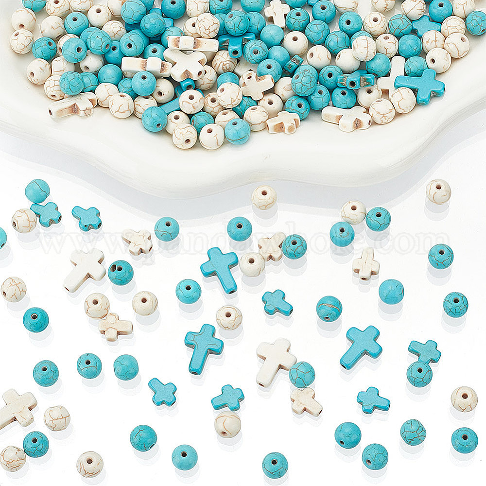 240 шт. 4 стили синтетические бирюзовые бусины, крест и круглый, смешанные окрашенные и неокрашенные