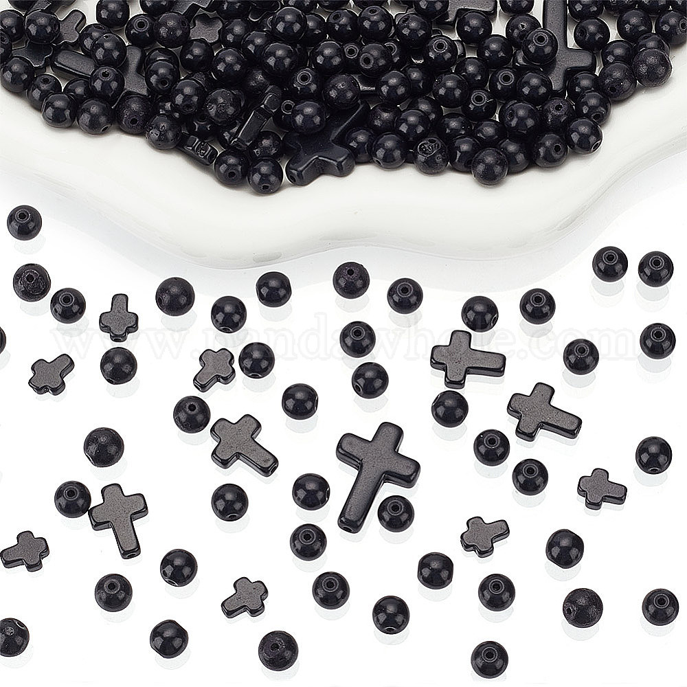 • Черный 235 шт. 4 стили синтетические бирюзовые бусины, окрашенные, круглый и крест, чёрные, 8~16x8~18x3~8 мм, отверстие : 1 мм