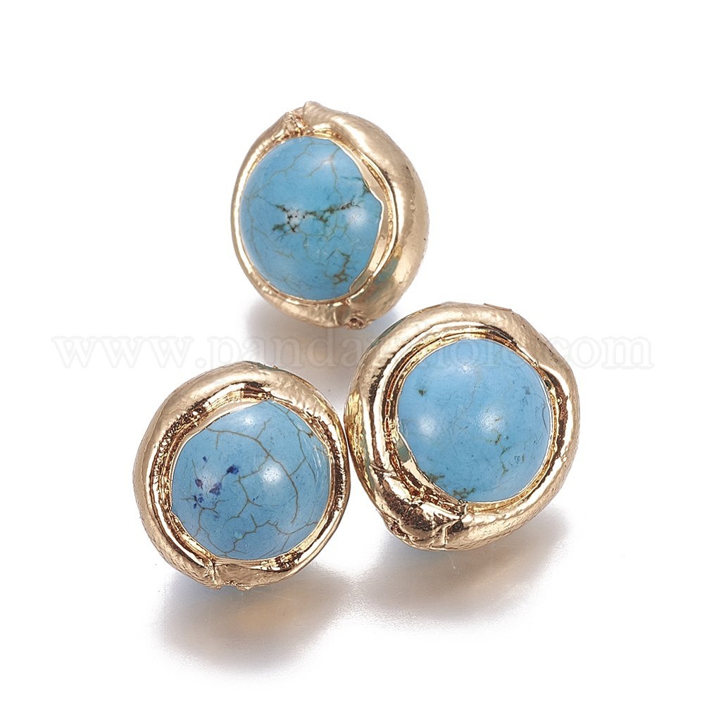 Синтетические бирюзовые бусины, край позолоченный, круглые