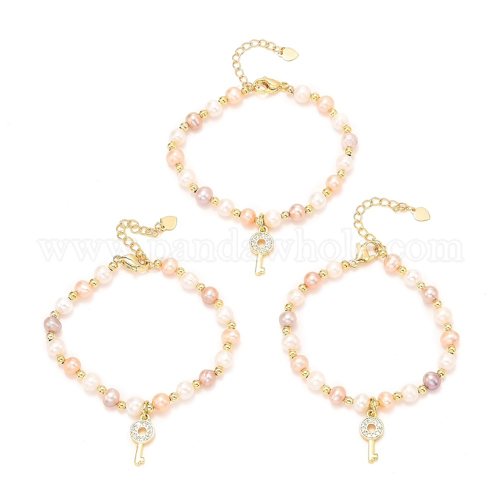 Браслеты с подвесками для ключей из латуни с микропаве и кубическим цирконием, реальный 18 k позолоченный, с натуральной жемчужиной, долговечный