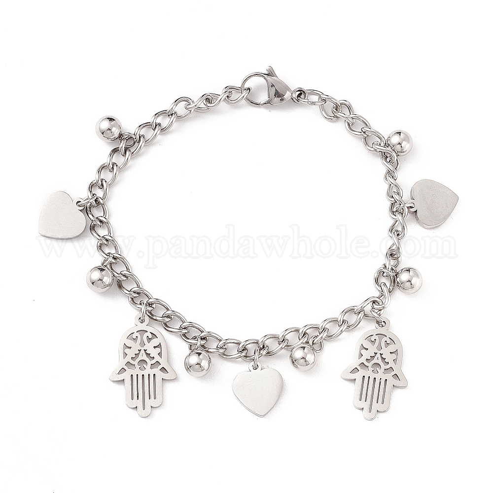 • Нержавеющая Сталь Цвет Устойчивый к потускнению 201 браслет из нержавеющей стали с подвесками в виде сердца и хамсы на руку с цепочкой панцирного плетения для женщин, цвет нержавеющей стали, 8-1/8 дюйм (20.6 см)