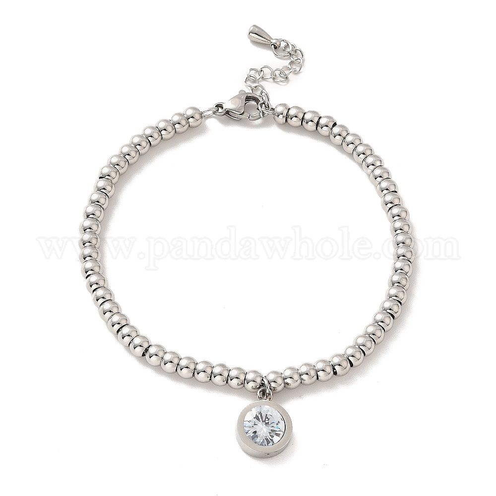 304 плоский круглый браслет из нержавеющей стали с прозрачным кубическим цирконием, 201 браслет из круглых бусин из нержавеющей стали для женщин