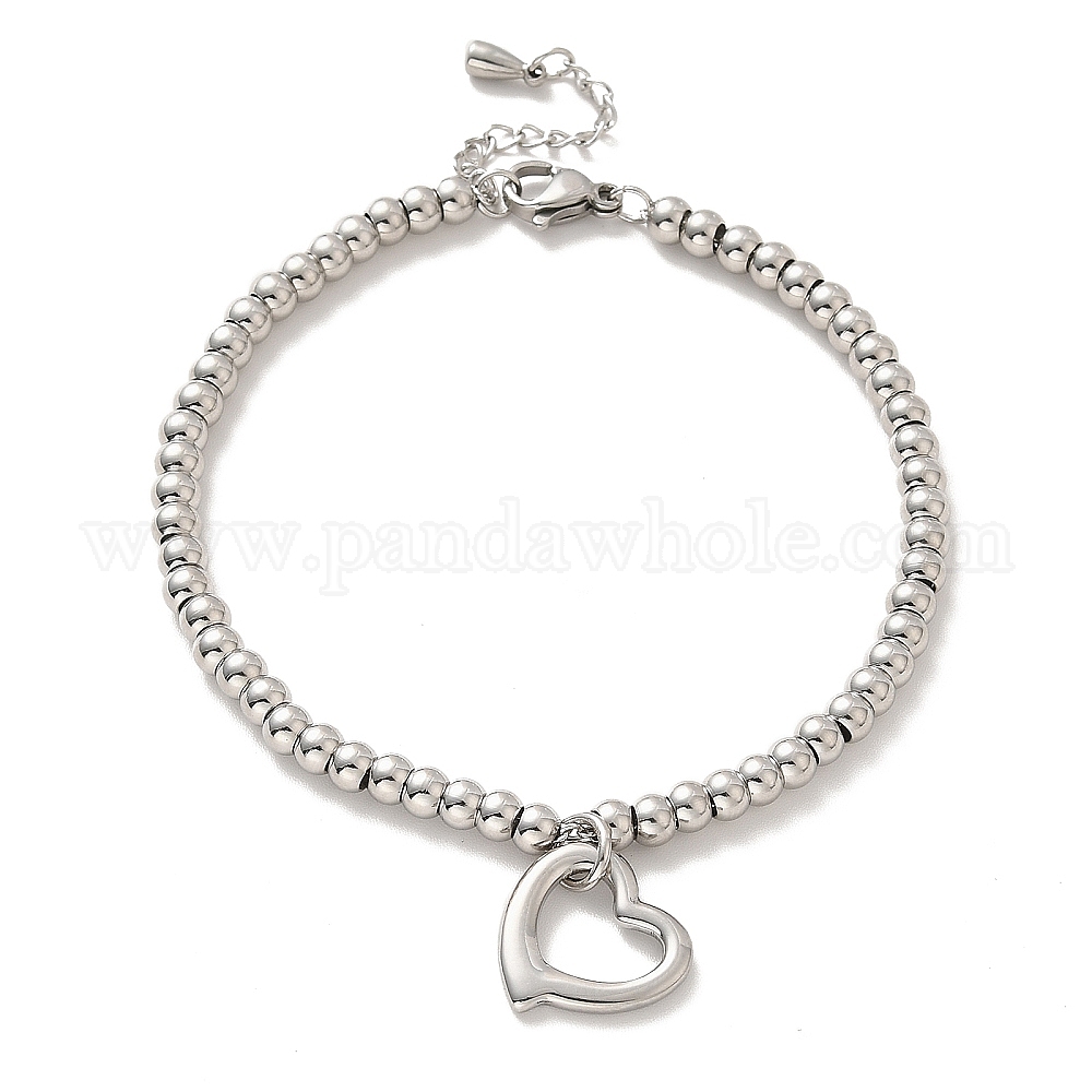 304 браслет-подвеска в виде сердца из нержавеющей стали с круглыми бусинами из нержавеющей стали для женщин