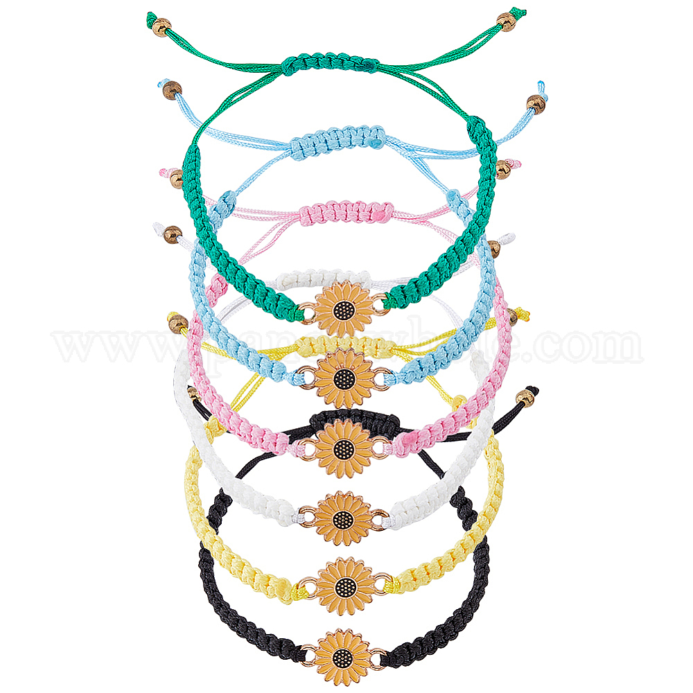 6шт 6 цвета сплав эмаль подсолнечник звенья браслеты набор, регулируемые браслеты из полиэфирного шнура для женщин