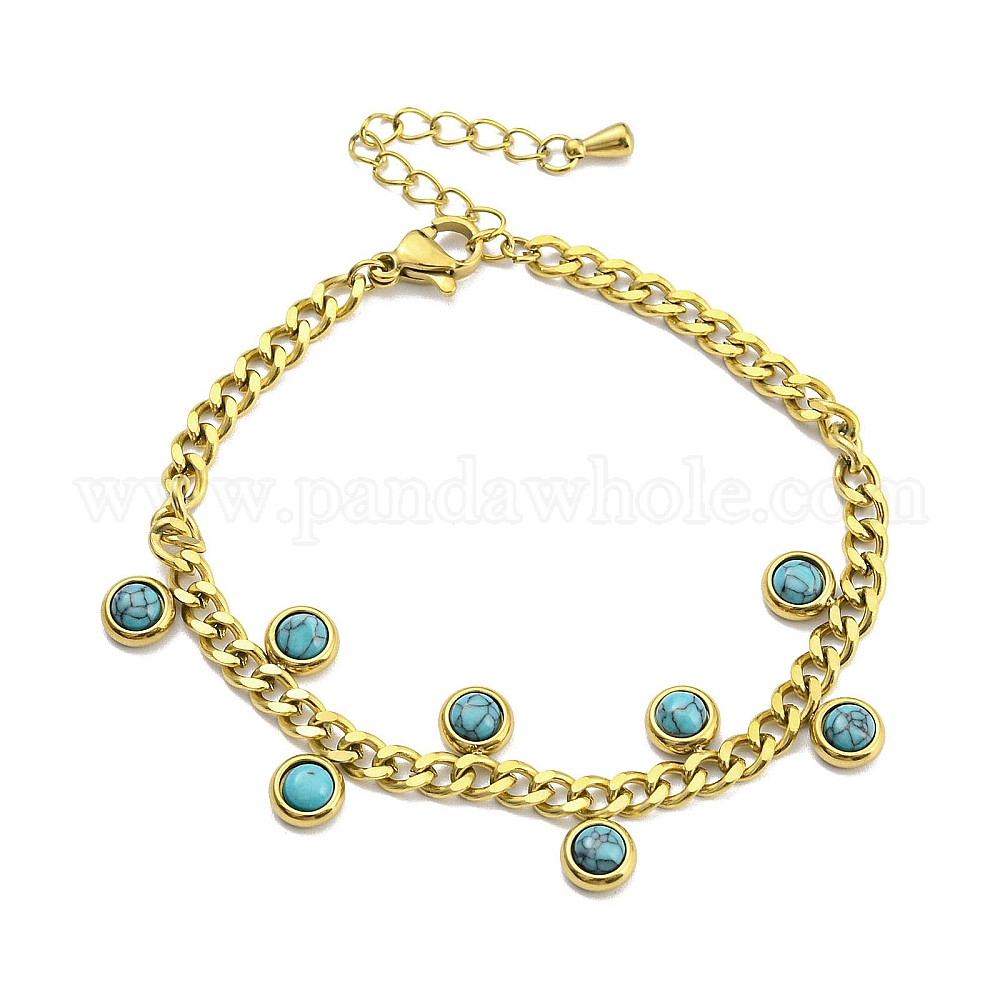 • Золотой Синтетический бирюзовый плоский круглый браслет с подвесками, с ионным покрытием(IP) 304 Бордюрные цепи из нержавеющей стали, золотые, 6-1/2 дюйм (16.4 см)