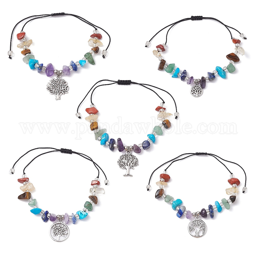• Смешанные камни Браслеты из плетеных бусин из натуральных и синтетических драгоценных камней чакра, Регулируемые браслеты с подвесками из сплава «Древо жизни» для женщин, внутренний диаметр: 1-3/8~3-3/8 дюйм (3.5~8.5 см)