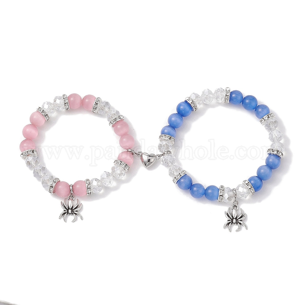 2шт 10мм круглые наборы эластичных браслетов «кошачий глаз» и стеклянных бусин для влюбленных, Браслеты из сплава с подвесками в виде паука на Хэллоуин с магнитными застежками в форме сердца для женщин и мужчин