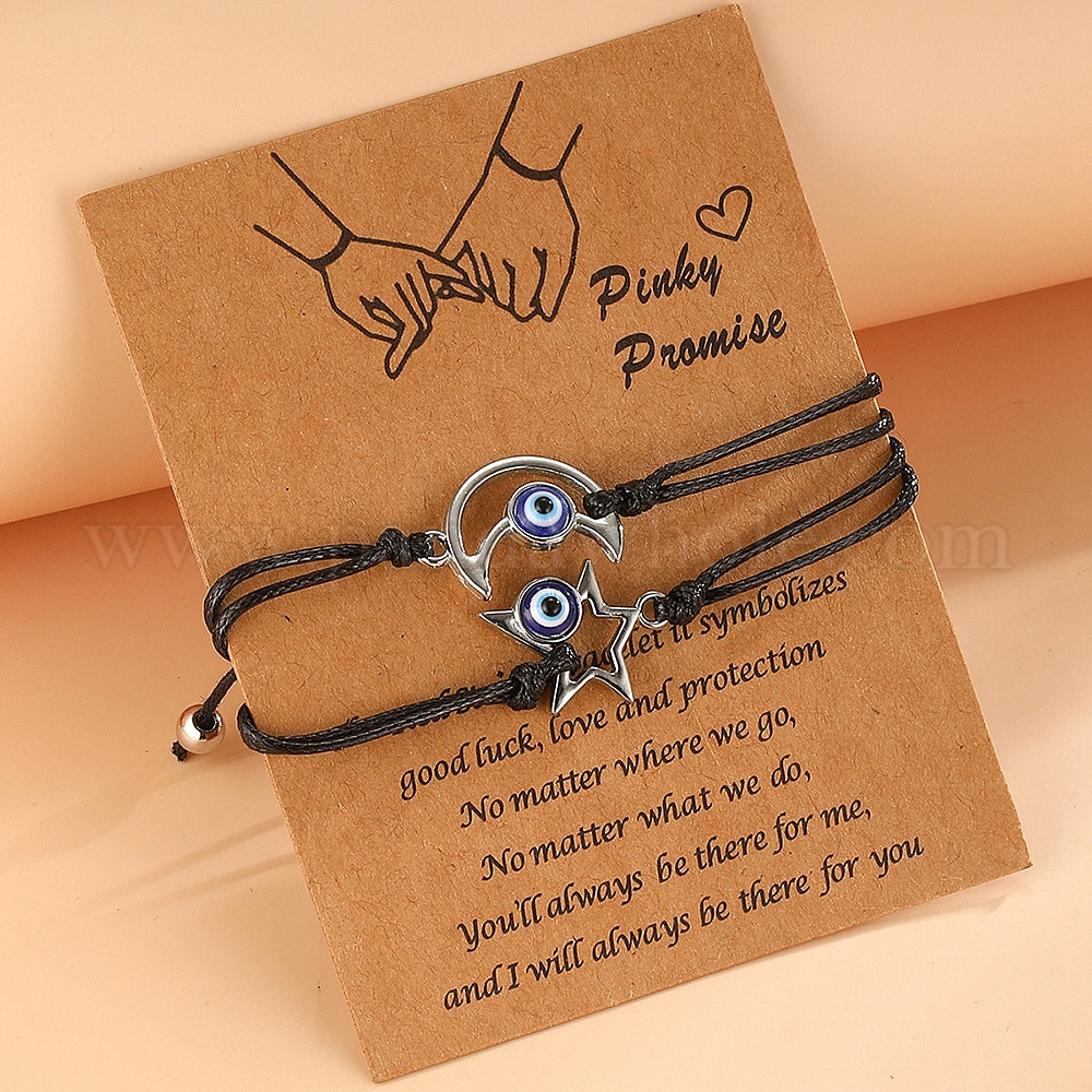 Наборы браслетов ручной работы на День святого Валентина с звеньями звезды и луны сглаза лэмпворк, регулируемые браслеты из воскового шнура для пары