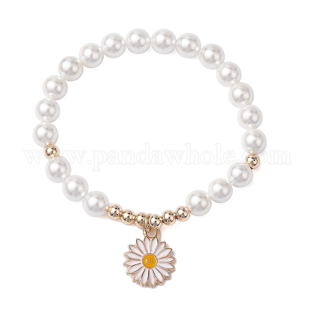 • Белый 7 Эластичные браслеты с круглыми ракушками и жемчугом диаметром мм, Браслеты с подвесками из сплава эмали с цветком ромашки для женщин, белые, внутренний диаметр: 1-7/8 дюйм (4.8 см)