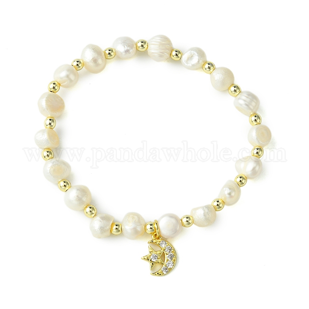 Эластичные браслеты из натурального культивированного пресноводного жемчуга, Браслеты с подвесками из латуни со звездами и луной для женщин, прозрачный кубический цирконий