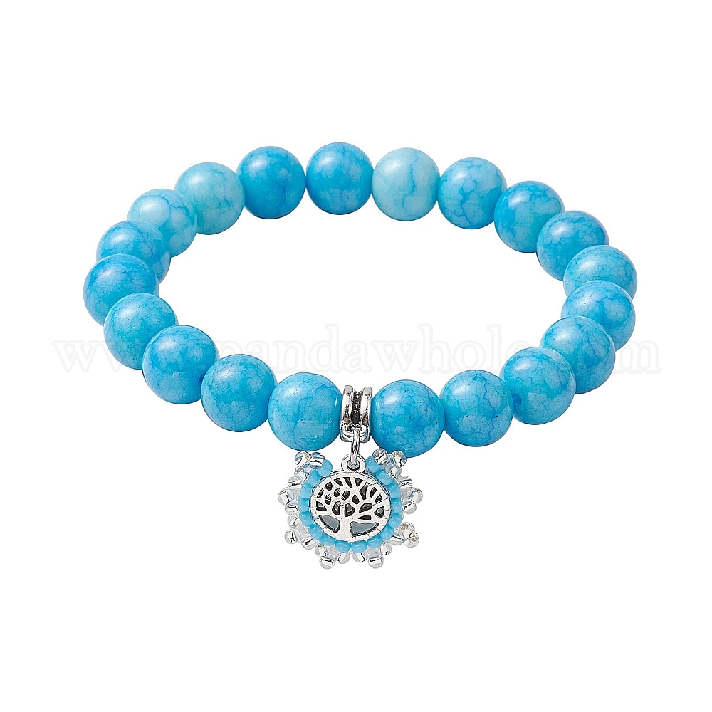 10.5круглые эластичные браслеты из непрозрачного стекла с кракле и бисером диаметром 7 мм., браслеты с подвесками «Древо жизни» из сплава