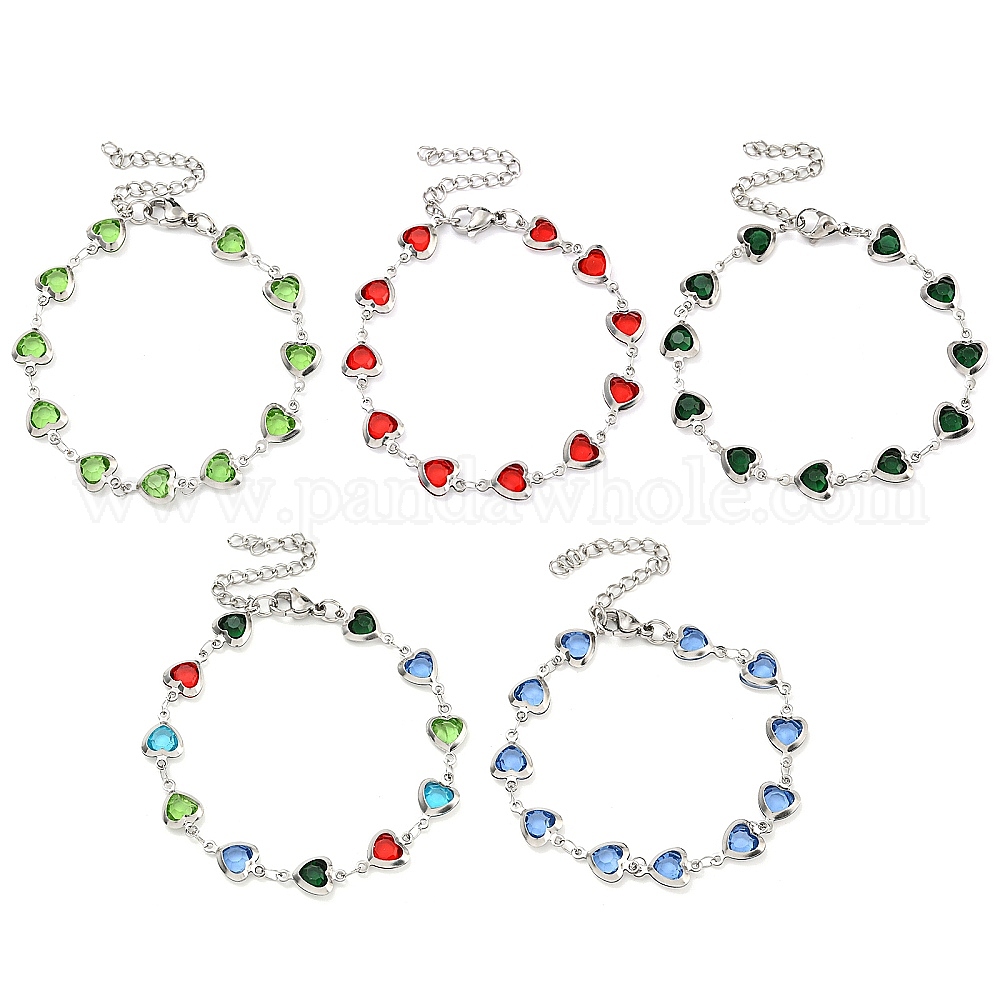 • Разноцветный 304 женские браслеты-цепочки в виде сердечек из нержавеющей стали и стекла, цвет нержавеющей стали, красочный, 6-1/2 дюйм (16.5 см)