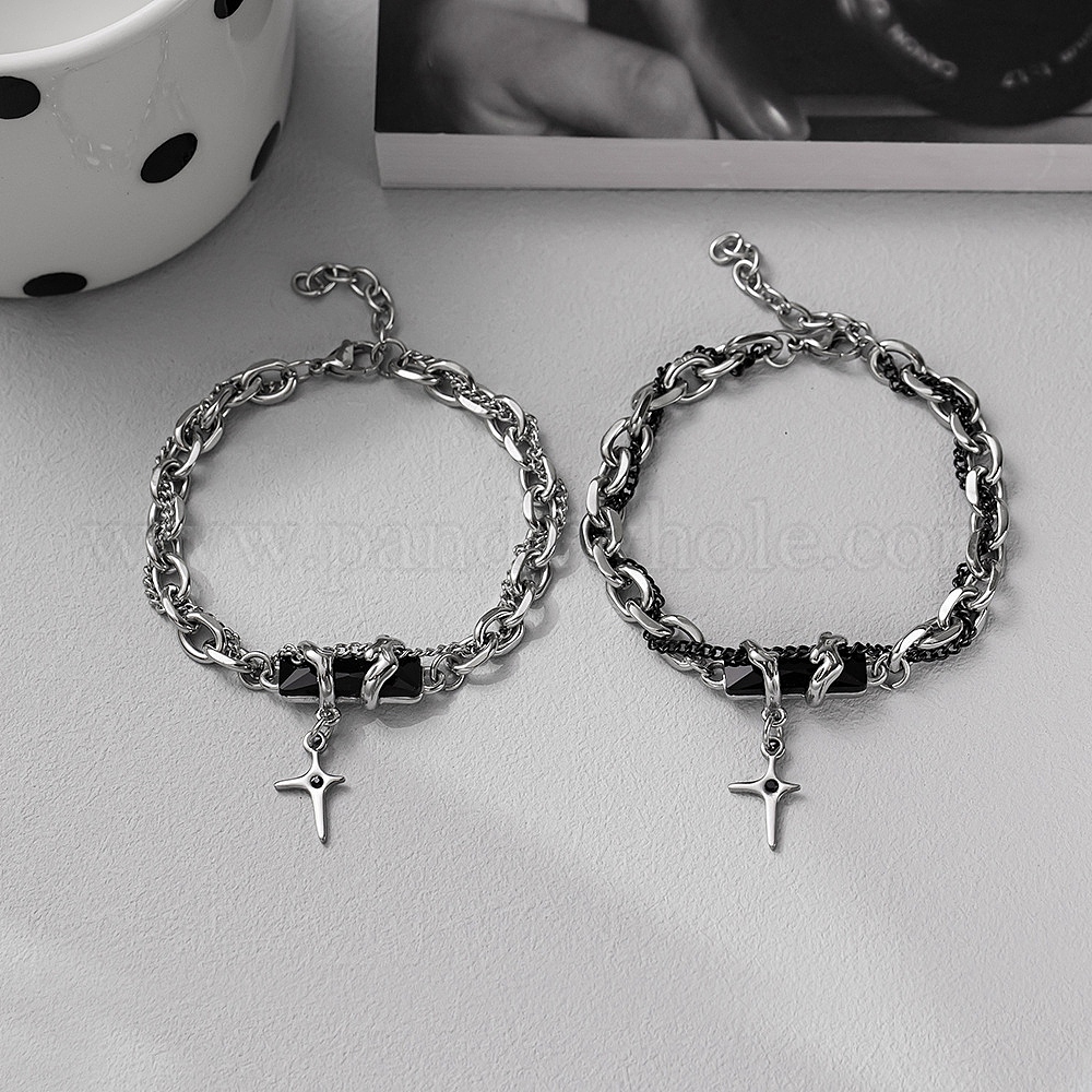 • Черный Из нержавеющей стали шарм браслеты, двухслойные бечевки драгоценные камни ювелирные изделия для унисекс, крестик, чёрные, 7-7/8 дюйм (20 см)
