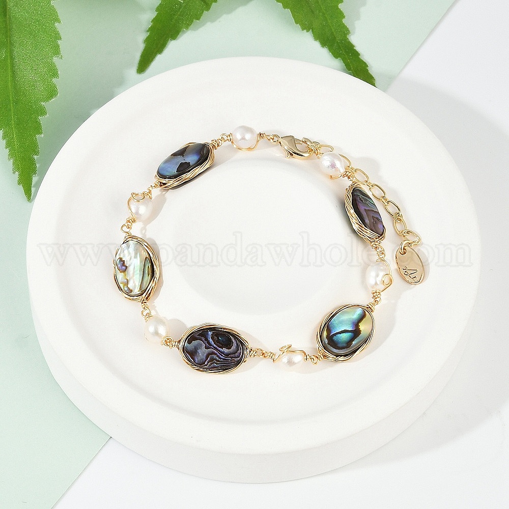 Браслеты из овальных латунных звеньев из ракушек-абалонов, с жемчугом