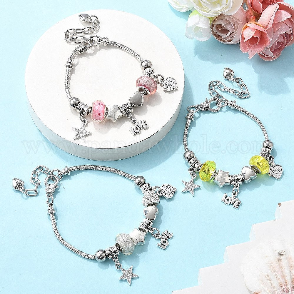 • Pink Латунные европейские бусины браслеты с подвесками, платиновые браслеты-змейки для женщин, звезда и сердце и слово любовь, cmолой, розовые, 7-7/8 дюйм (20 см)