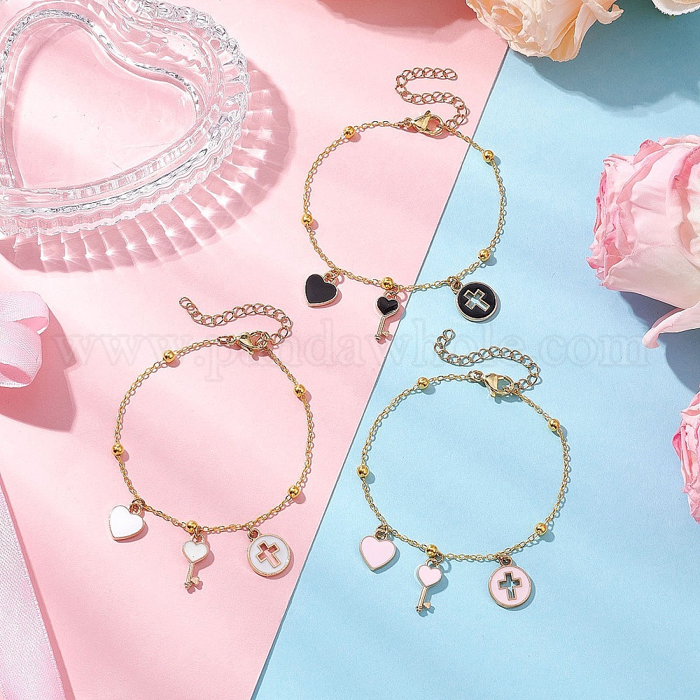 Латунные плоские овальные кабельные цепные браслеты, сплав эмали подвески браслеты с подвесками для женщин, сердце и ключ и плоский круг с крестом