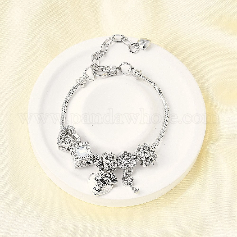 Сплав европейские бусины браслеты с подвесками, браслеты из змеиной цепи для женщин, сердце, ключ и бант, со стразами, без свинца и без кадмия