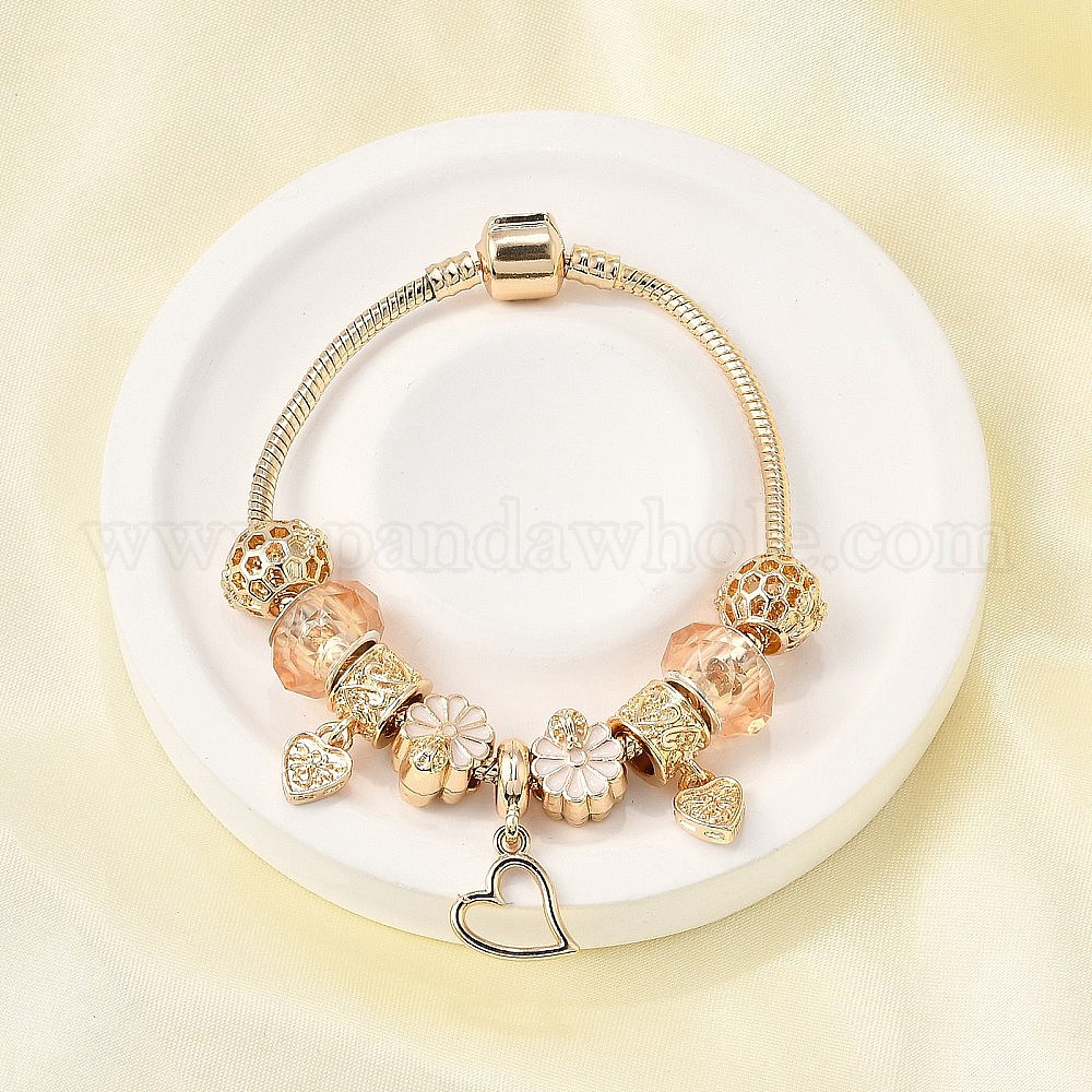 Сплав эмаль европейские бусины браслеты с подвесками, браслеты из змеиной цепи для женщин, Сердце & цветок, со смолевыми бусинами, без свинца и без кадмия
