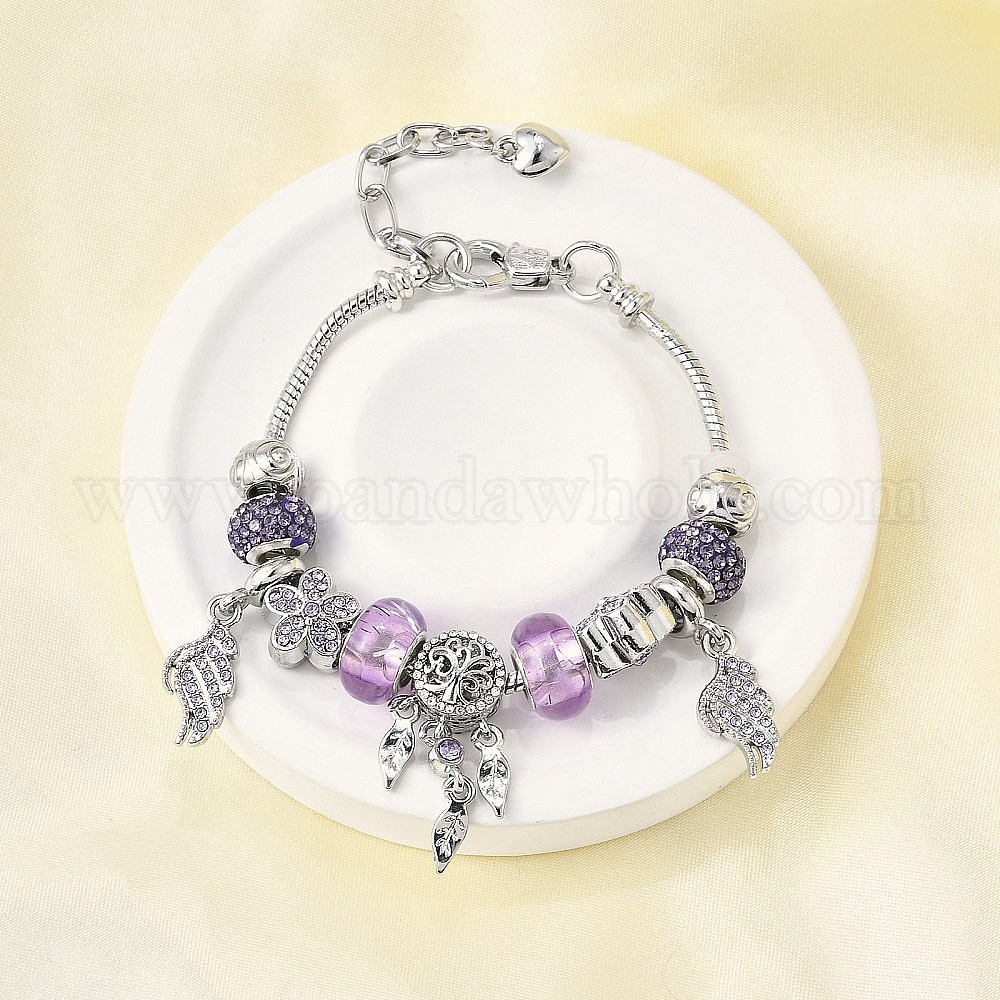 Сплав европейские бусины браслеты с подвесками, браслеты из змеиной цепи для женщин, лист и крыло и цветок, со стразами из смолы и полимерной глины и силиконовыми бусинами, без свинца и без кадмия