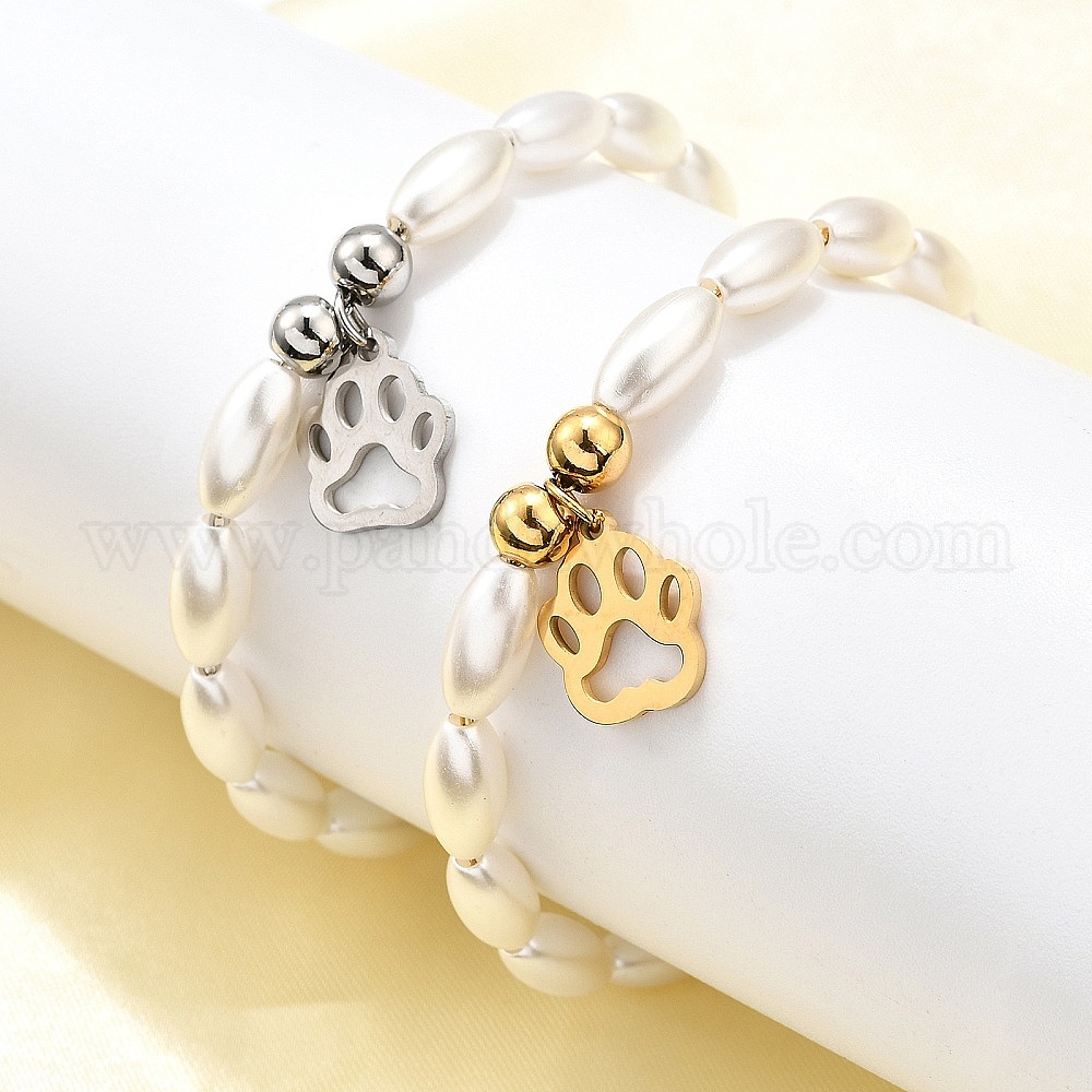 304 Браслеты из нержавеющей стали с подвесками в виде отпечатков лап для женщин, с пластиковыми бусинами из искусственного жемчуга