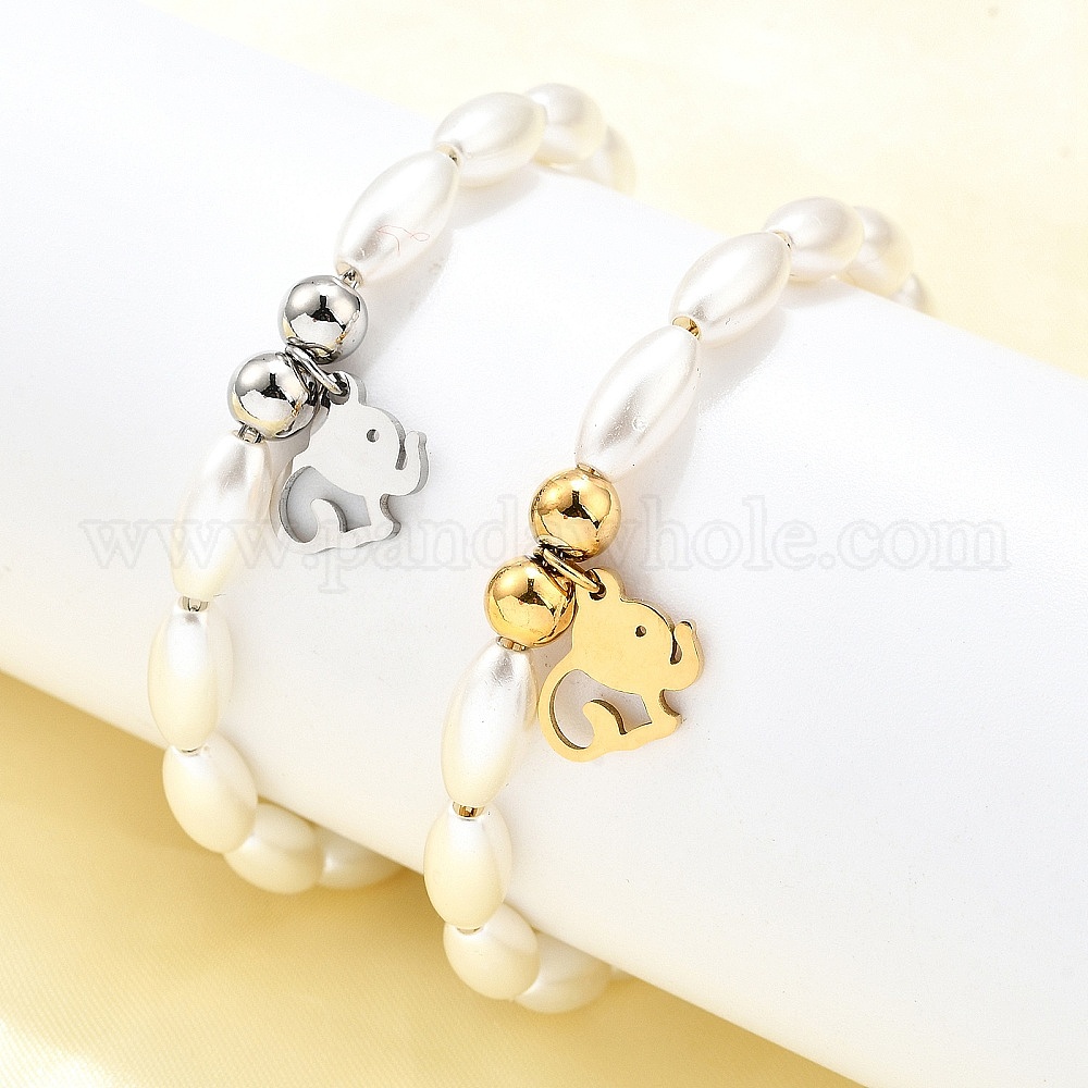 304 Браслеты из нержавеющей стали с подвесками в виде слона для женщин, с пластиковыми бусинами из искусственного жемчуга
