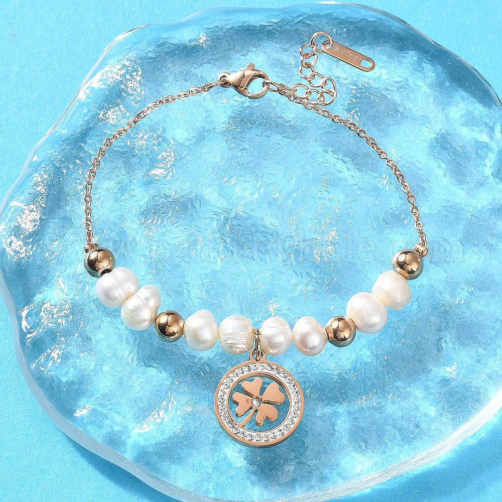 304 Браслеты из нержавеющей стали с подвесками в виде клевера для женщин, со стразами из полимерной глины и натуральным жемчугом, ионное покрытие (ip)