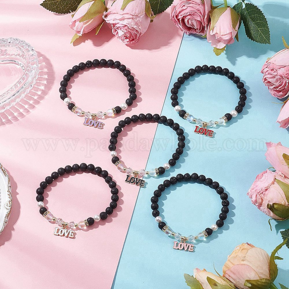 5шт. тематика дня святого валентина круглые бусины из натуральной лавы и синтетического лунного камня растягивающиеся браслеты, сплав эмали подвески браслеты с подвесками для женщин, любить