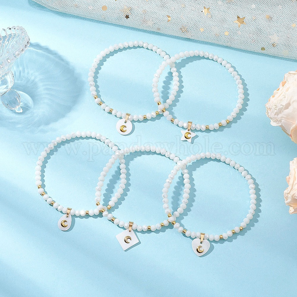 5шт 5 стили браслеты с подвесками из натуральной пресноводной ракушки и металлического лунного среза, круглые бусины toho и гальванизированные стеклянные граненые бусины, растягивающиеся браслеты, золотые, разнообразные